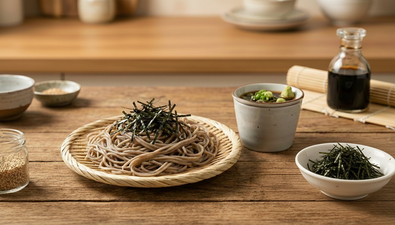 Spaghetti di grano saraceno freddi con natto, cipolline, alga nori e altre delizie