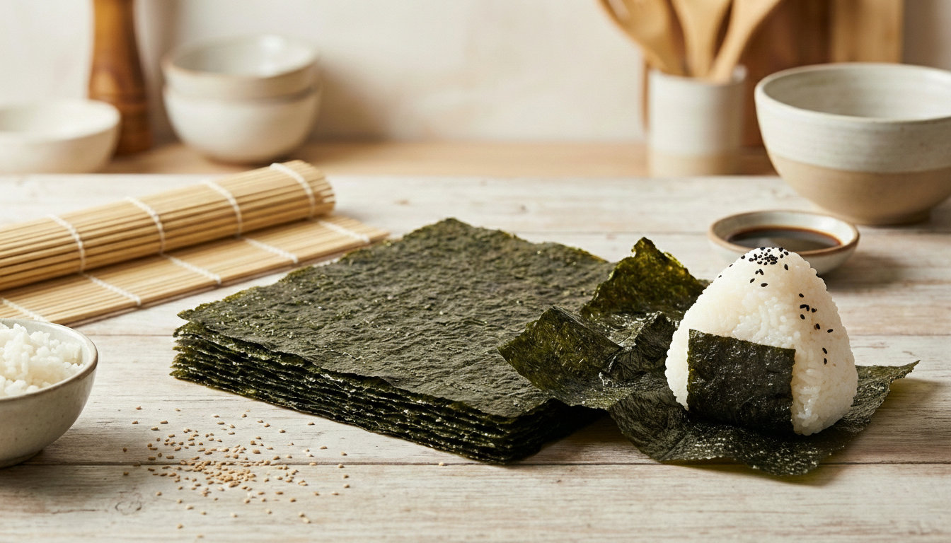 L'alga Nori Γ¨ un tipo di alga marina essiccata, sottile e di colore verde scuro, largamente utilizzata nella cucina giapponese, soprattutto nella preparazione del sushi e degli onigiri (polpette di riso), ma anche come guarnizione per zuppe, insalate e per aggiungere sapore e nutrimento a vari piatti, l'alga Nori Γ¨ un ingrediente versatile e salutare, capace di arricchire qualsiasi piatto con il suo caratteristico e delicatissimo gusto di mare.